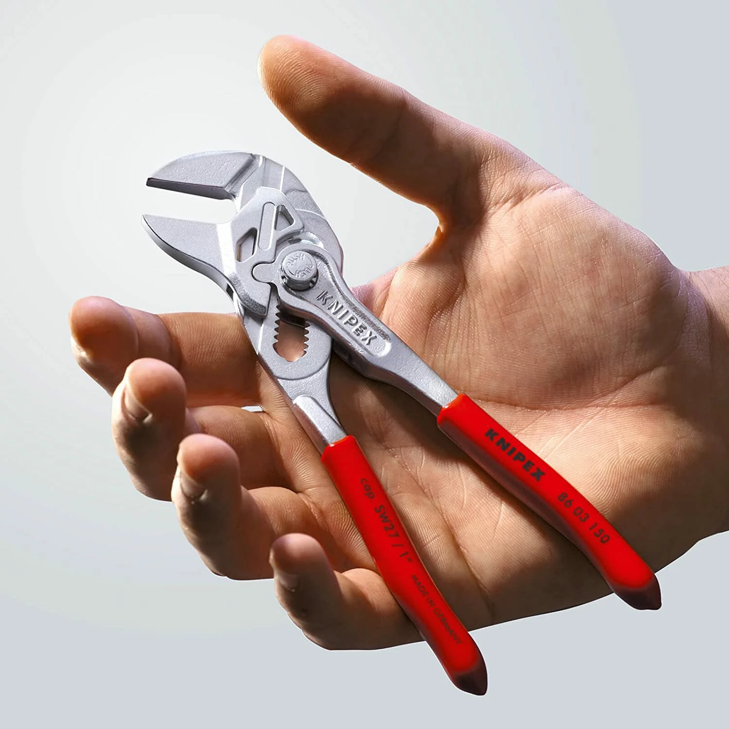 - The Knipex 86 03 Series Pliers Wrench with dipped PVC handles and smooth parallel jaws for cautious installation of plated fittings or sensitive surfaces.