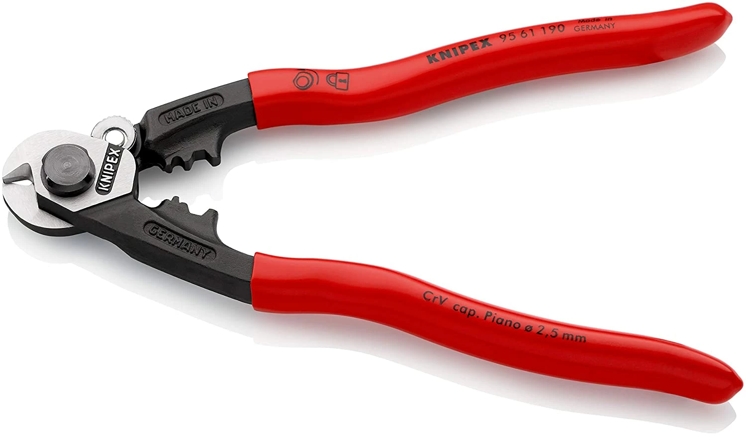 The Knipex 95 61 190 wire rope shears are ideal for medium-hard wire cables up to 7mm diameter without splaying, including those that are extremely strong, such as for example tyre cord. They also have two crimping dies for end caps on Bowden cable sheaths and end ferrules for traction cables and the blades are hardened to approximately 64HRC for added strength and durability
