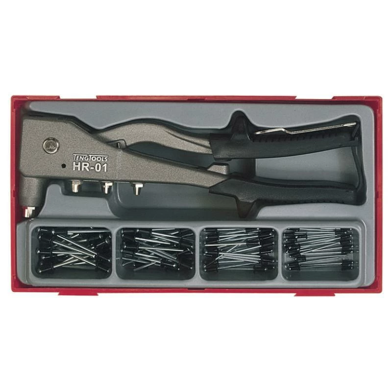- Teng Tools 81 piece heavy duty hand rivet set containing: * hand rivet gun,with four nozzles, to suit aluminium and steel blind rivets 20 x aluminium rivets 2.4mm, black, 20 x aluminium rivets, 3.2mm, black 20 x aluminium rivers, 4.0mm, black * 20 x aluminium rivets, 4.8 mm, black * nozzle wrench.